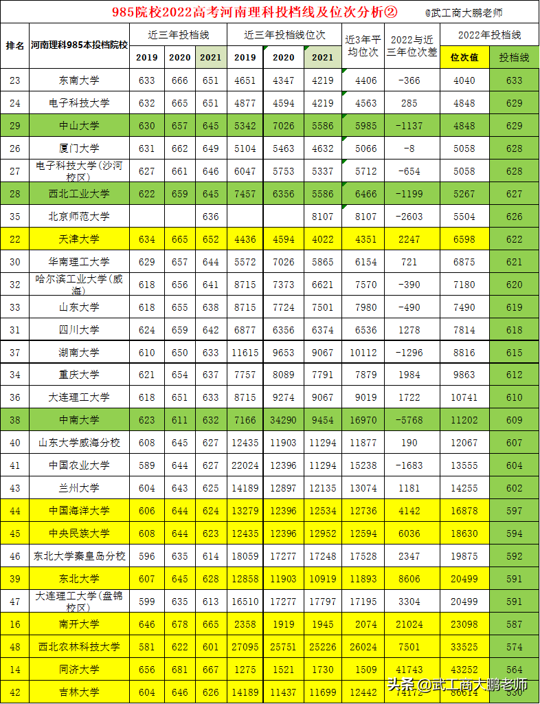 河南没有985院校,优秀河南考生只有出省读985,由于省外院校招生规模相对省内院校较少,投档线除了头部的清北之外很难准确预估。爆冷意外也频繁出现。2020年中南大学爆冷、2021年华科单列爆冷、2022吉林大学、同济、南开爆冷……