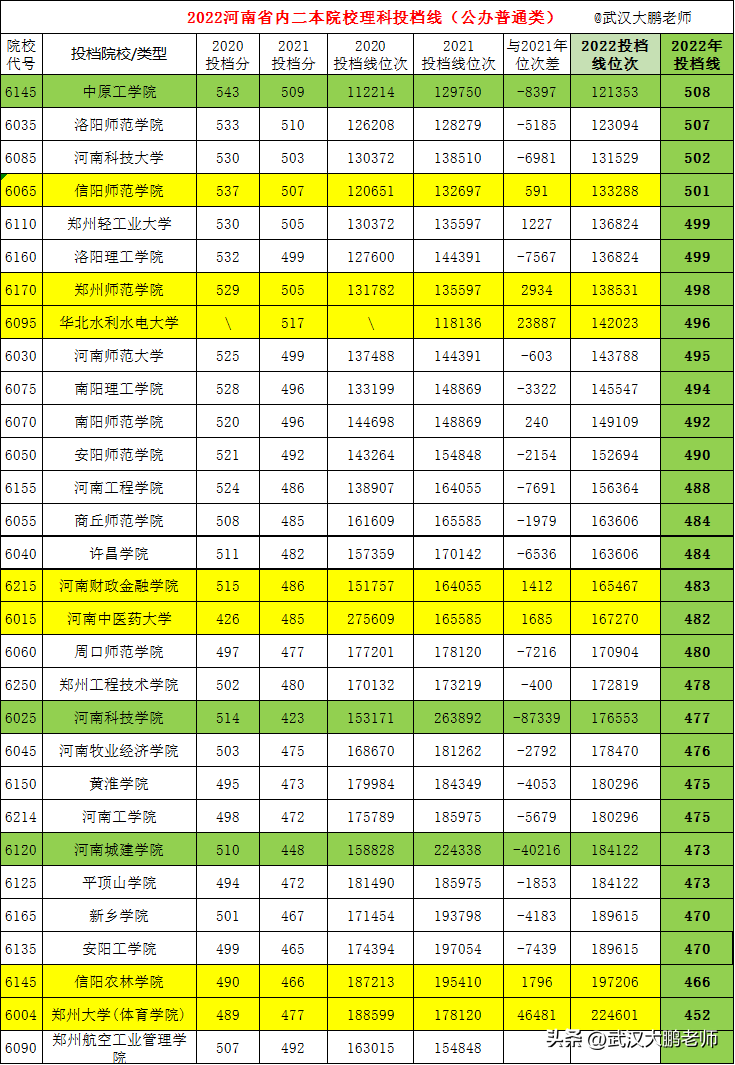 整体来说2022年理科二本分数线公办院校普遍上涨,最低分信阳农林学院466分、郑大体育学院452分;低于这个分数只能读民办或其他高收费类。