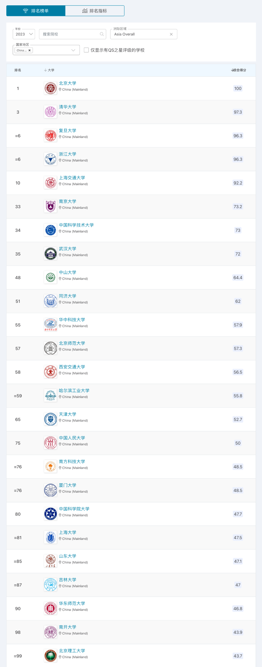 2023 QS 亚洲大学排名TOP 100 高校详细名单如下: