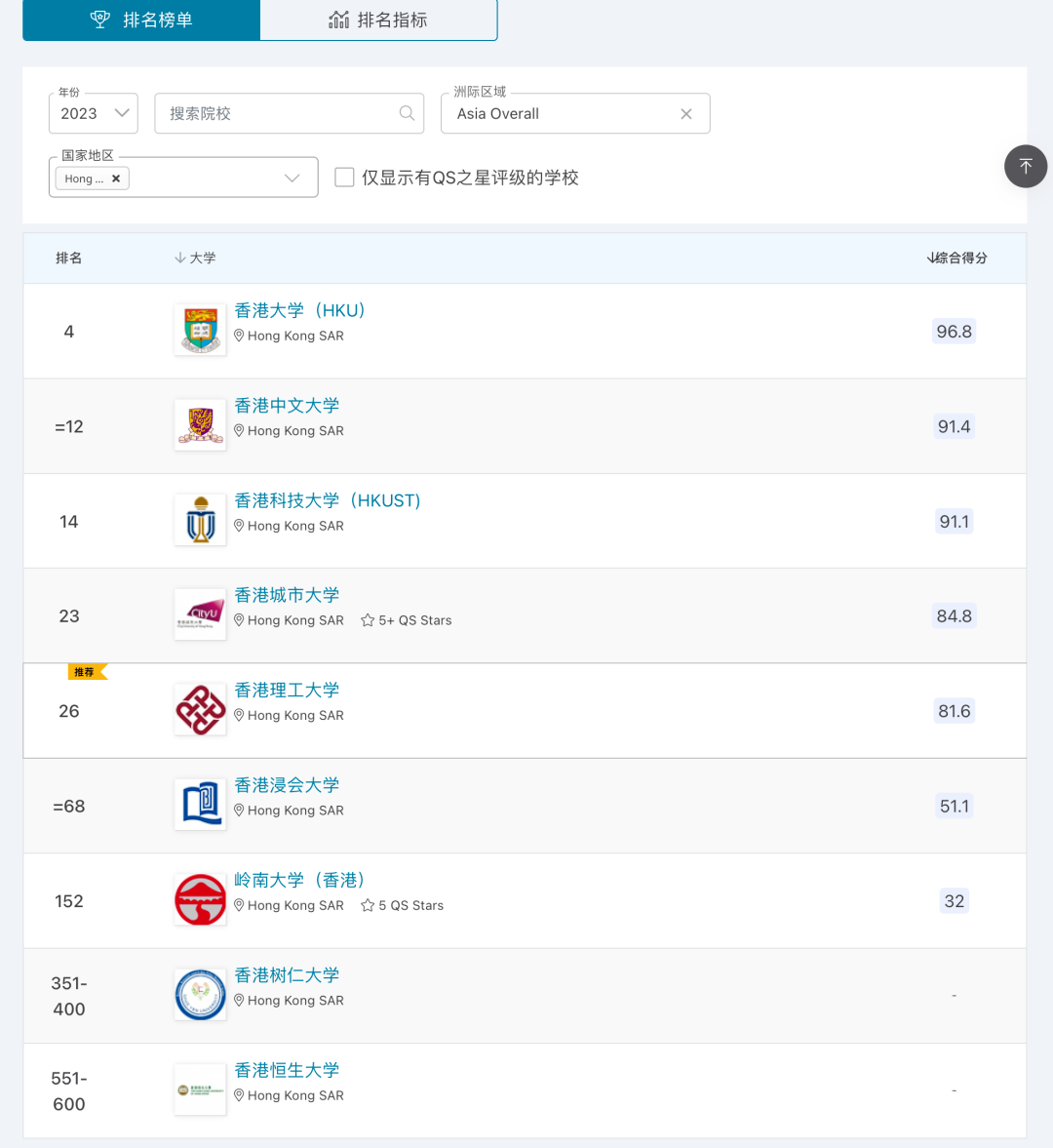 进入前百的港校一共有6所:香港大学、香港中文大学、香港科技大学、香港城市大学、香港理工大学、香港浸会大学。