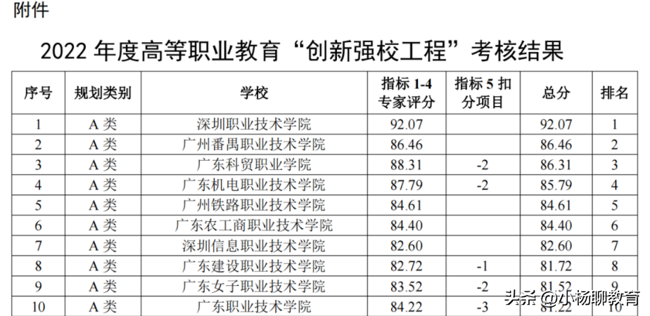 在广东省教育厅对2022年度高等职业教育“创新强校工程”考核结果中,深圳职业技术学院以92.07的专家评分重新回到广东省高职高专的榜首。
