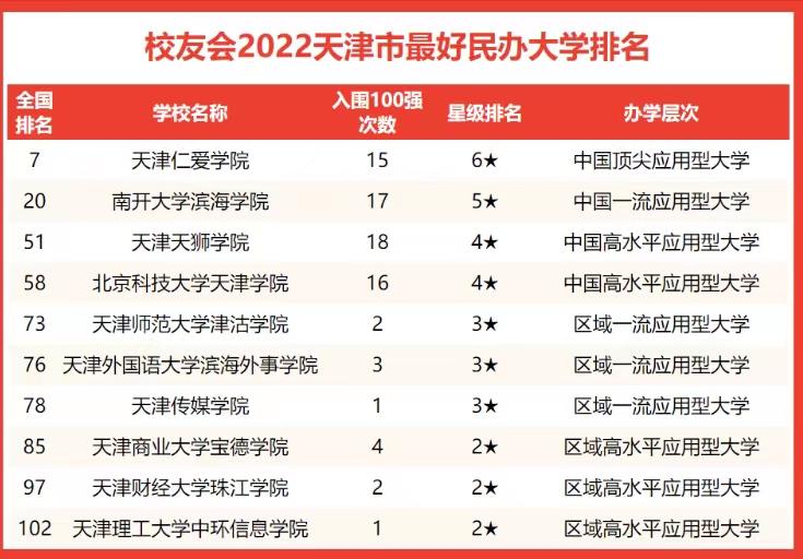 在天津市民办大学榜单中,天津仁爱学院、南开大学滨海学院、天津天狮学院居榜单前3名,是天津市最好的民办大学。
