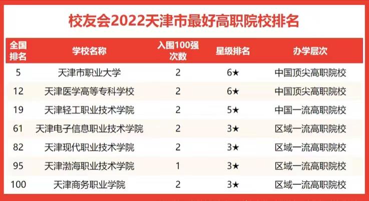 在天津市高职院校榜单中,天津市职业大学、天津医学高等专科学校、天津轻工职业技术学院居榜单前3名,是天津市最好的高职院校。