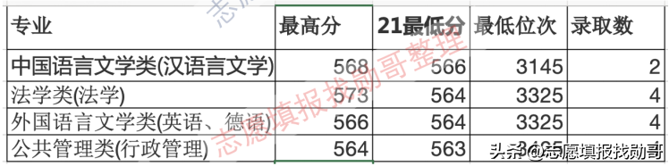 如下图所示,文科专业的录取分之间的差别,比理科少多了。最高分566,最低分563分。