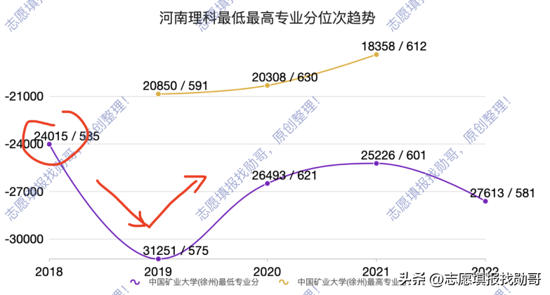 数据趋势非常清晰,最好的专业录取小幅攀升,最低专业2022年出现下跌,且跌幅巨大!拖累中国矿业大学整体录取,2022年非常难看!