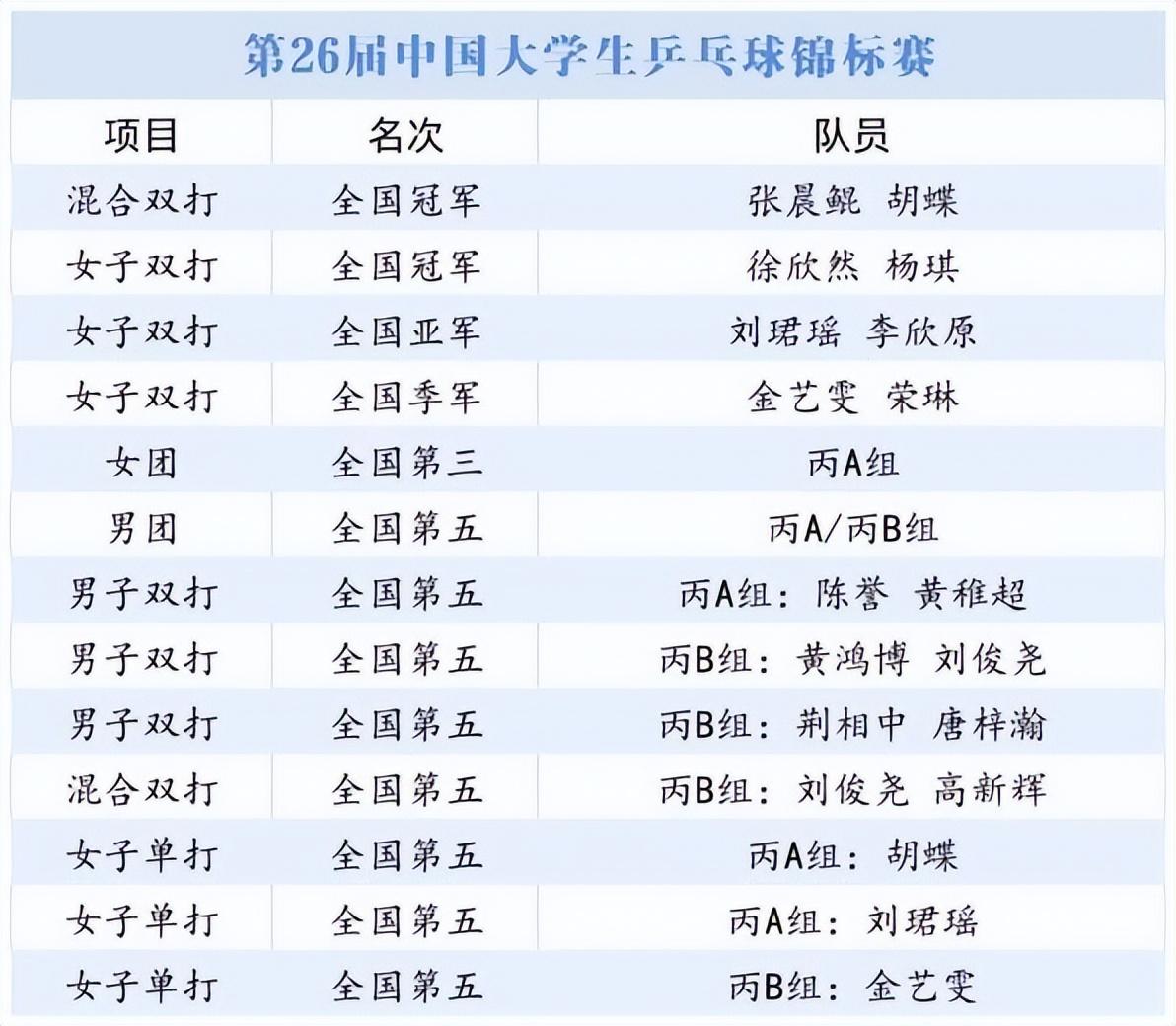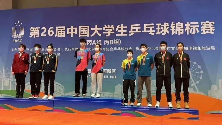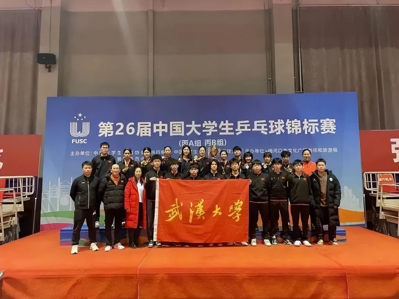 近日,在成慧君领队和汪杰、杨博宇、李宜珊三位教练的带领下,武汉大学乒乓球高水平运动队男队丙A组/丙B组、女队丙A/丙B组共20名队员,代表武汉大学参加第26届中国大学生乒乓球锦标赛丙组比赛。经过6天激烈角逐,运动健儿们共为武汉大学争得2金1银2铜,女子团体丙A组荣获全国第三名,男子丙A/丙B组团体在比赛过程中的表现也可圈可点,敢打敢拼,斩获全国第五的佳绩。