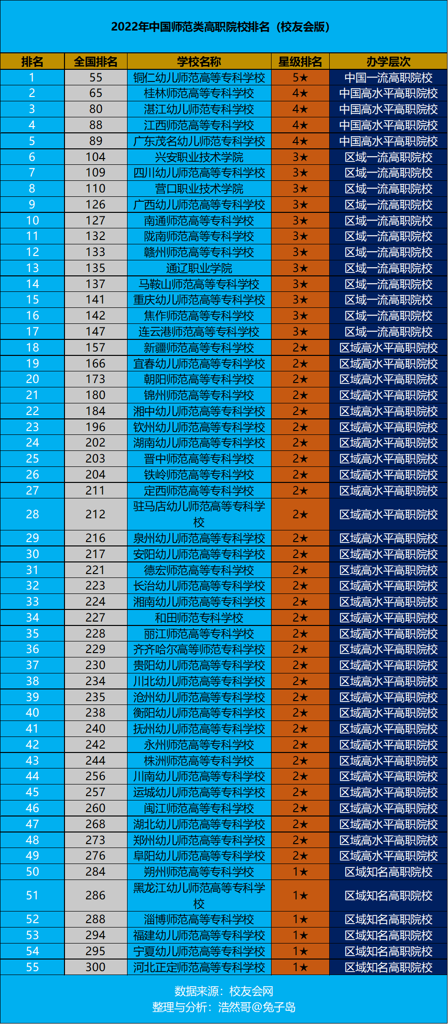 根据中国校友会网(艾瑞深中国校友会网 )最新发布的2022中国大学排行榜,2022年度的大学排名中共有55所高校进入中国师范类高职院校排名榜单!