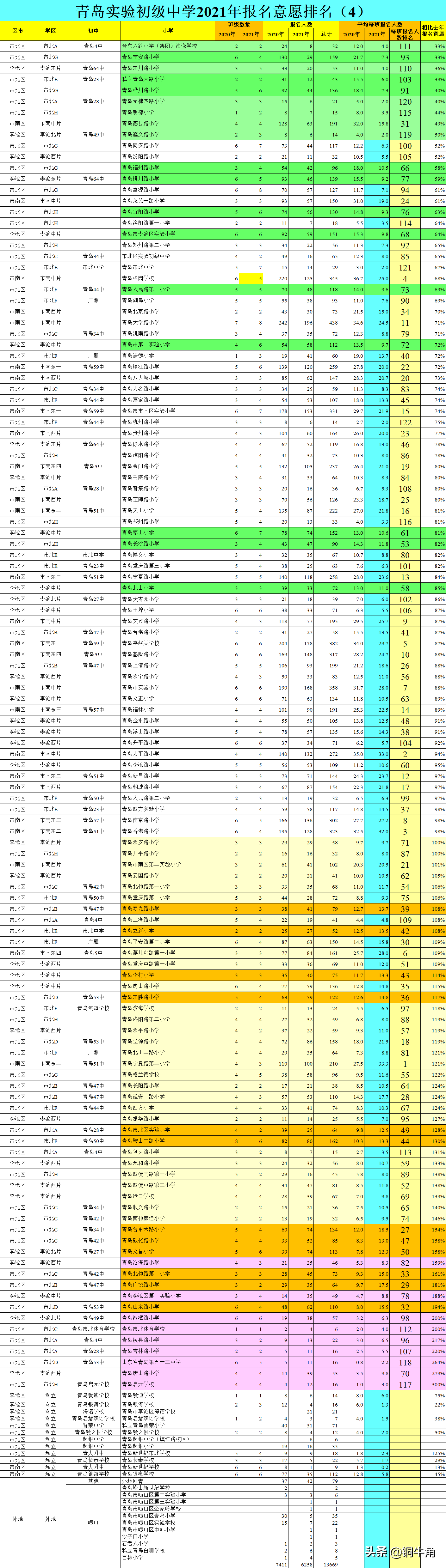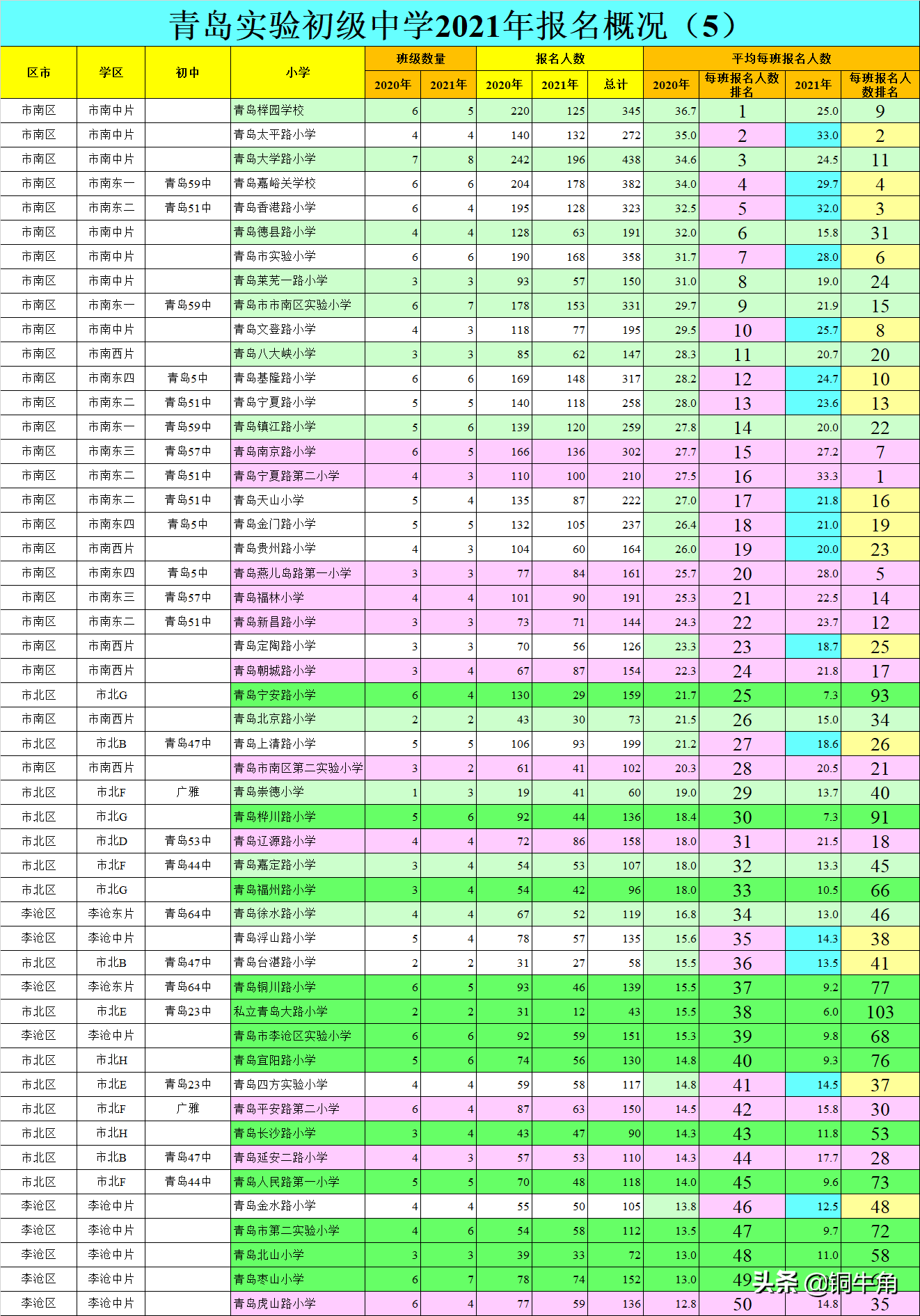 5)2020年每班报名人数最多的前50名中,也有12所学校,在今年被挤出,颜色标为深绿色,分别为:宁安路小学、福州路小学、铜川路小学、大路小学、李沧区实验小学、宜阳路小学、长沙路小学、人民路第一小学、青岛市第二实验小学、北山小学、枣山小学。