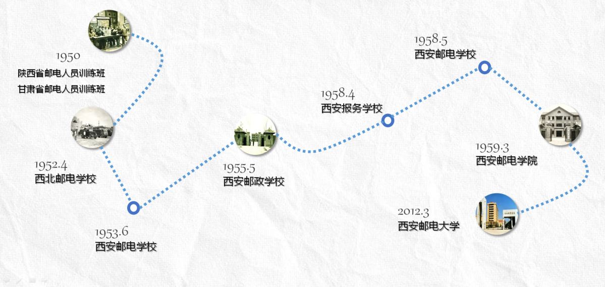 西安邮电大学的前身是1950年由邮电部西北管理局建立的陕西和甘肃省邮电人员培训班,1952年邮电部西北管理局将两个培训班合并成为西北邮电学校,1953年改名为西安邮电学校,1955年再次改名为西安邮政学校,同时具备招收专科生的资格。1958年邮电部撤销西安报务学校,并入西安邮政学校,同时将西安邮政学校改名为西安邮电学校,并且增开了电信专业。1959年经国务院批准,西安邮电学校改名为西安邮电学院,2012年经教育部批准,西安邮电学院更名为西安邮电大学。