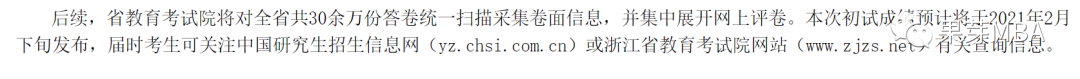 浙江在之前发布的《研考平稳收官!2021年2月下旬将发布成绩》文章中提到:本次初试成绩预计将于2021年2月下旬发布。