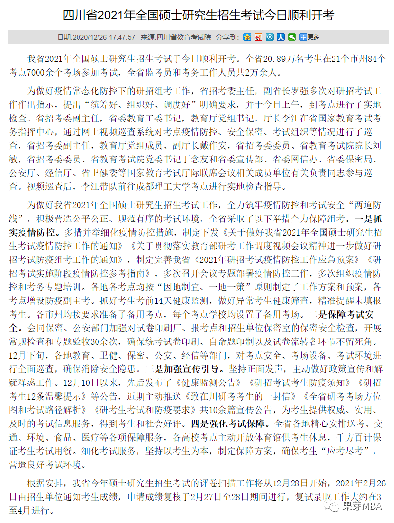 之前四川省发布的《四川省2021年全国硕士研究生招生考试今天顺利开考》通知中有提到:四川省今年硕士研究生招生考试的评卷工作将从12月28日开始,2021年2月26日由招生单位通知考生成绩,申请成绩复核的考生请于2月27日至28日联系招生单位书面申请登记,复试录取工作大约在3月下旬开始,4月底前完成。