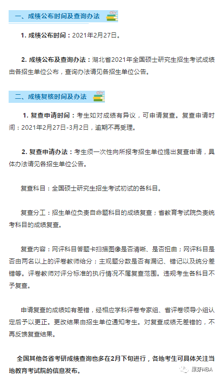 湖北省发布的关于湖北省2021年全国硕士生招生考试信息中提到:成绩公布时间预计2021年2月27日。