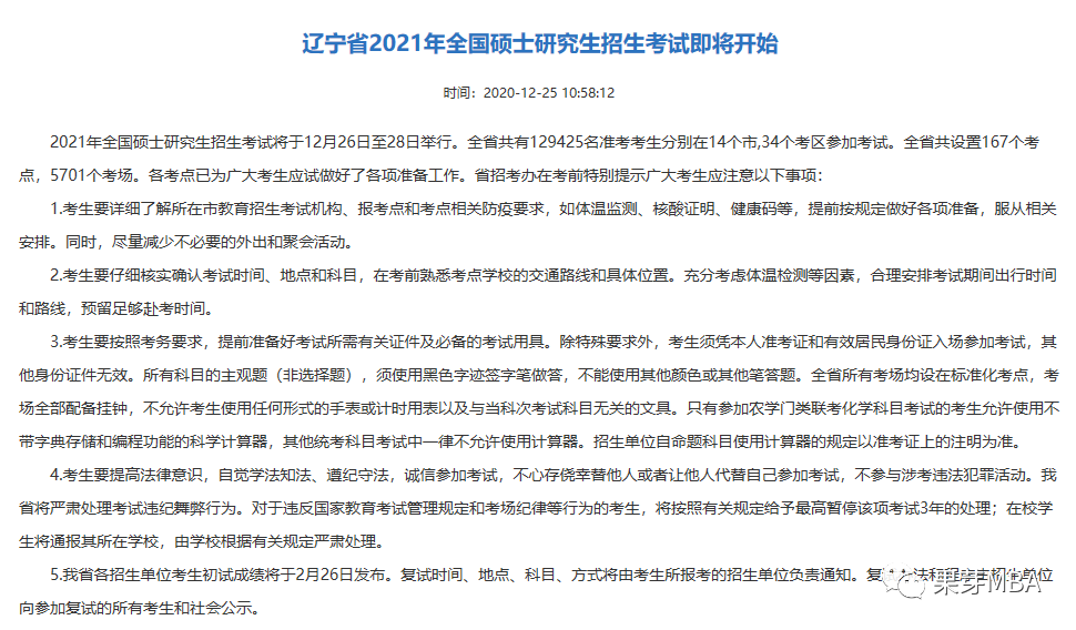 在之前辽宁省发布的《辽宁省2021年全国硕士研究生招生考试即将开始》的通知中说到:辽宁省各招生单位考生初试成绩将于2月26日发布。复试时间、地点、科目、方式将由考生所报考招生单位负责通知。