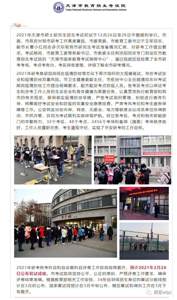 天津在之前的《2021年天津市硕士研究生招生考试初试顺利结束》一文中提到:预计2021年2月26日公布初试成绩。市考试院将坚持公平、公正的原则,严格评卷工作要求,确保评卷结果准确。根据教育部相关工作安排,34所自划线招生单位的复试分数线预计在3月初公布,国家复试线预计在3月中旬公布,随后复试和调剂工作在3月下旬展开。