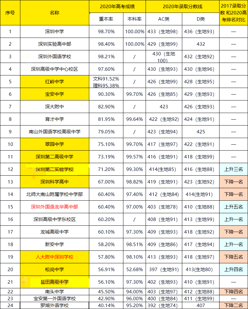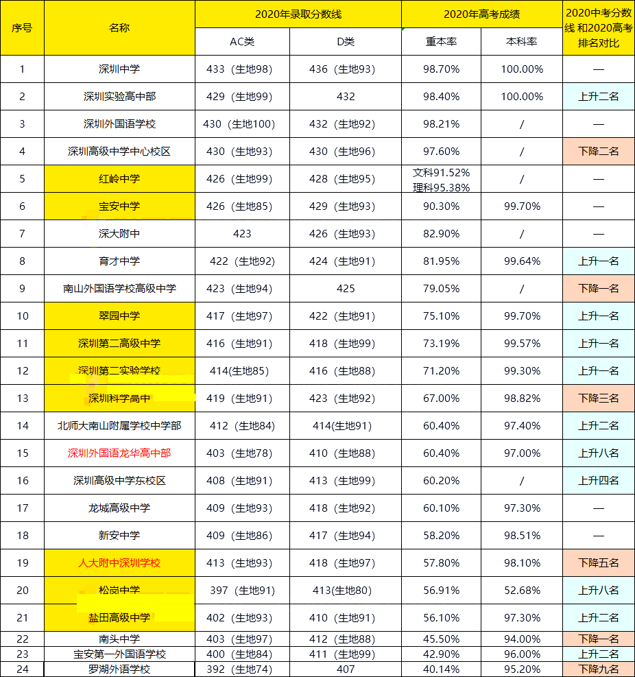 按照重本率排名,我选择了深圳排名前24的高中,其中标红的两所深圳外国语龙华高中部和人大附中深圳学校都是第一年高考,成绩能进入前二十,可以说是非常优秀了。