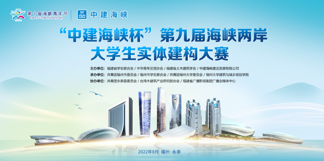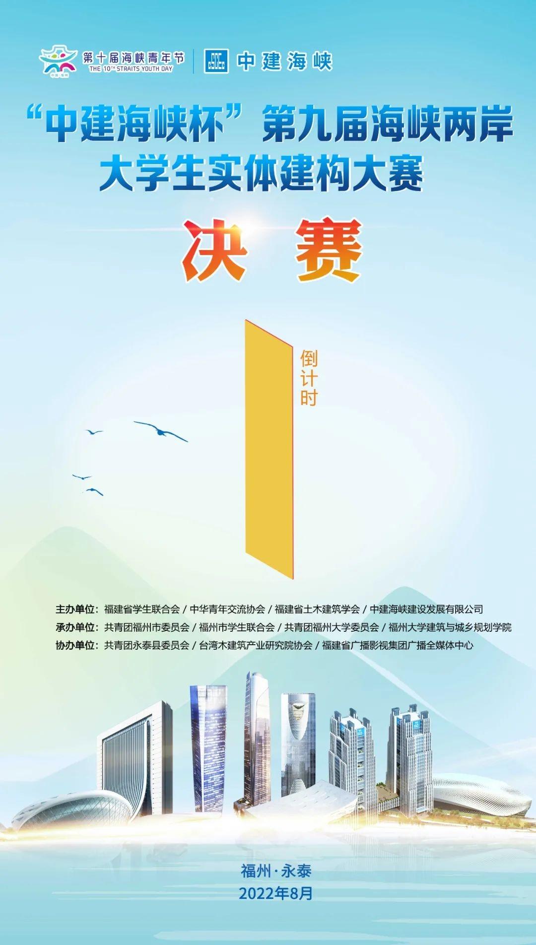8月2日至8月4日,由福建省学生联合会、中华青年交流协会、福建省土木建筑学会、中建海峡建设发展有限公司主办,共青团福州市委员会、福州市学生联合会、共青团福州大学委员会、福州大学建筑与城乡规划学院承办的第十届海峡青年节系列活动之“中建海峡杯”第九届海峡两岸大学生实体建构大赛决赛将在福州市永泰县梧桐镇坵演村举行。