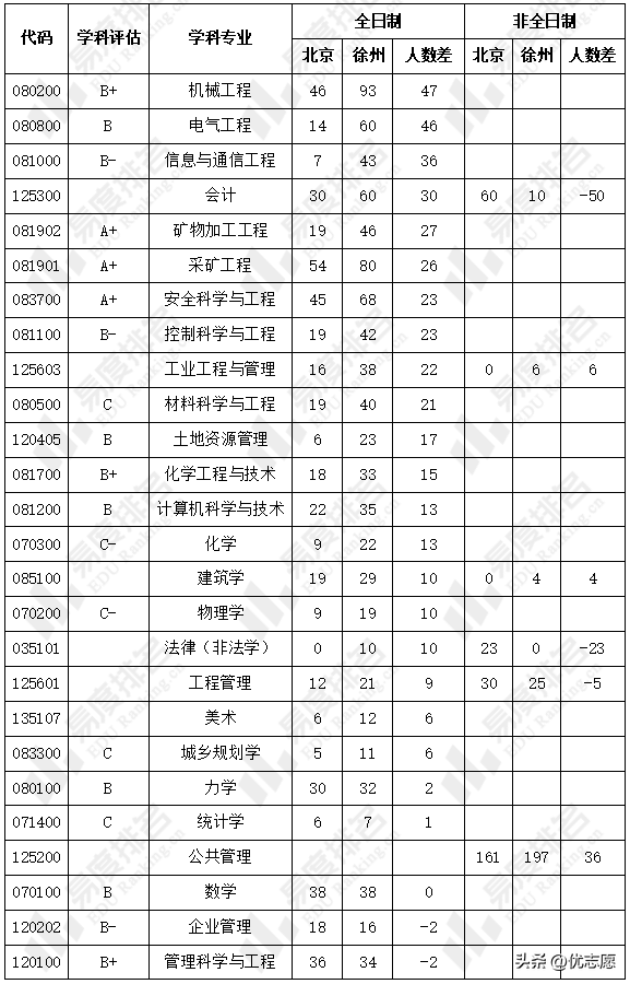 全日制专业中,机械工程、安全科学与工程、材料科学与工程、会计4个学科专业在徐州矿大的招生人数比北京矿大多出20人以上,且两校的最低录取分相差不大,建议考生报考徐州矿大;法律(法学)在北京矿大的招生人数更多且录取分更低,考生可优先报考北京矿大。