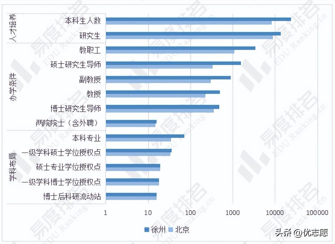 下图展示了北京矿大和徐州矿大在办学条件、学科布局等方面的对比。徐州矿大在师生规模、学科数量上均超过北京矿大,总体实力更强;而北京矿大的研究生占比更高,学校更倾向于研究生的培养,且地处北京,学生可获取到更多的外界资源。