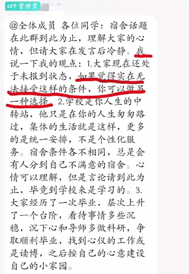 不过最让人没想到的是,当研究生新生们在班级群中讨论宿舍住宿条件差的时候,辅导员看不下去了,便打断了大家的讨论。但是后面辅导员的做法却让人有些看不懂了。