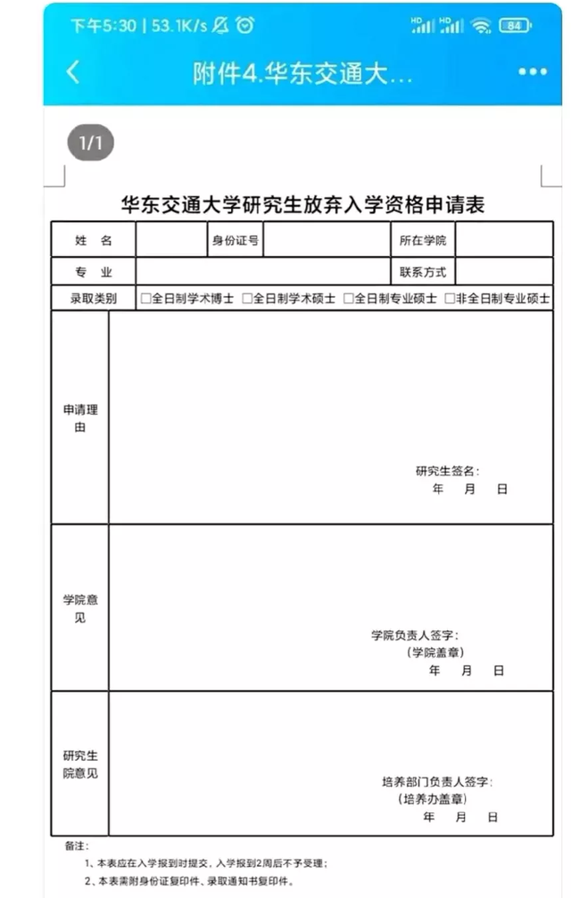 而辅导员口中的“另一种选择”就是放弃入学,因为辅导员说完这些话之后就在新生群中上传了一个表格,表格抬头是《华东交通大学研究生放弃入学资格申请表》。