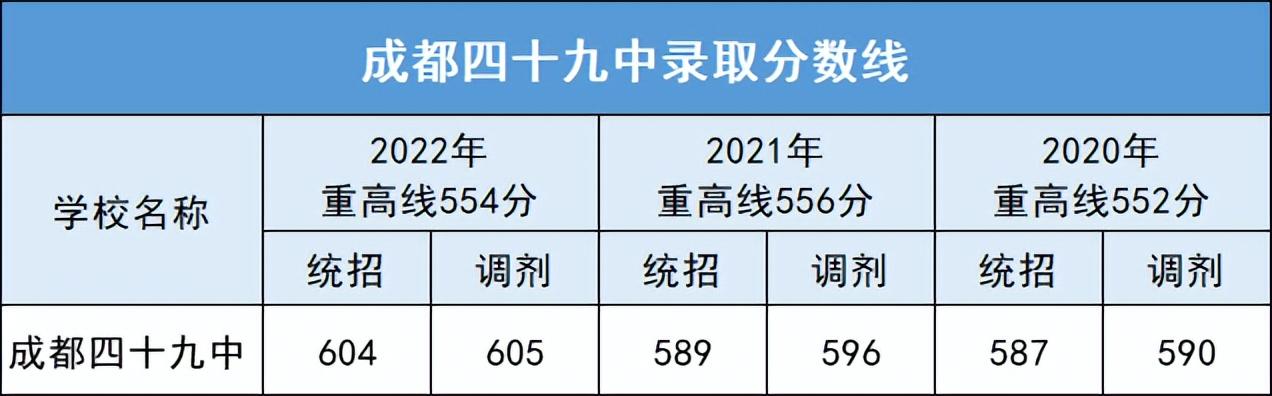 成都四十九中,2022年统招分数线604分,正式开启“600分+”之路,较去年上涨15分,超重点线50分。