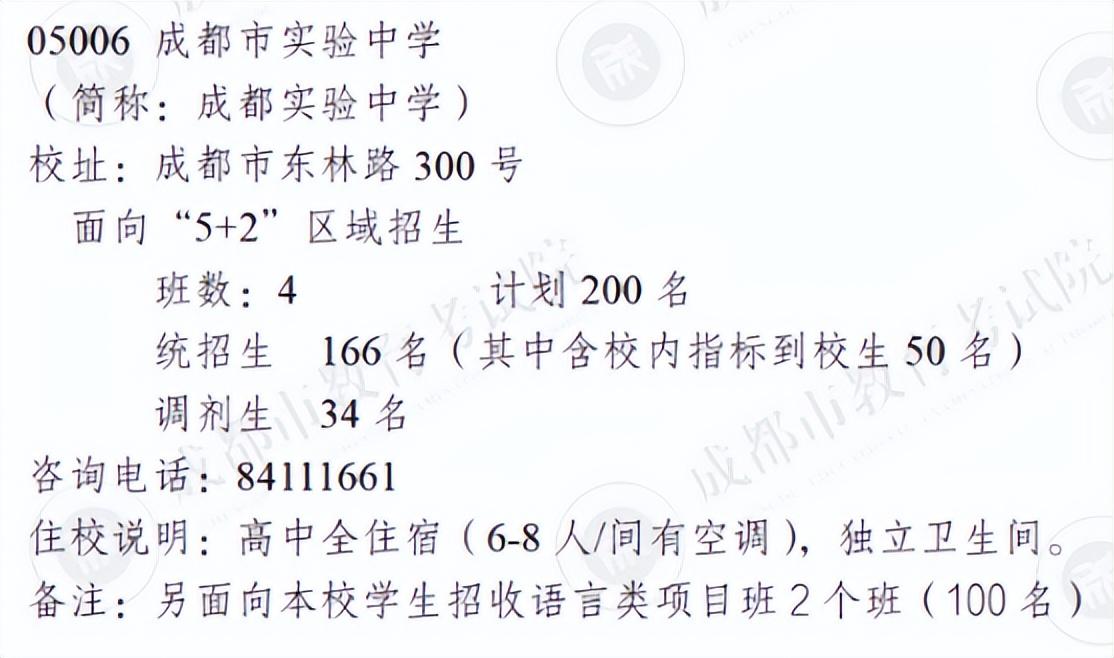 2022年,成都实验中学面向“5+2”区域招生200人。统招生166名,其中校内指标50人;调剂生34名。
