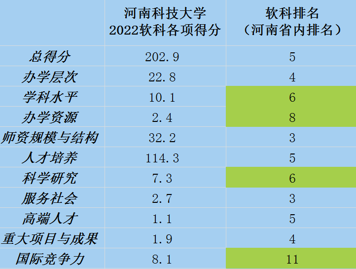 2022年软科是十大评价模块/指标中,河南科技大学在师资规模与结构、服务社会、办学层次、重大项目与成果、人才培养、高端人才等指标得分中,均排名河南前五。这也是河南科技大学排名进步的原因。