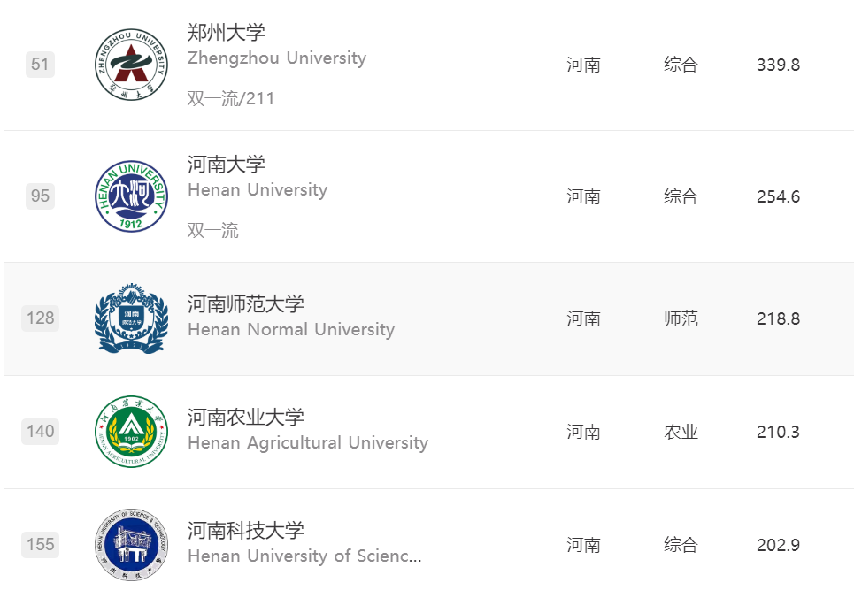 同时,河南科技大学的软科排名,在河南省排名第五(仅次于郑州大学、河南大学、河南师范大学、河南农业大学)。