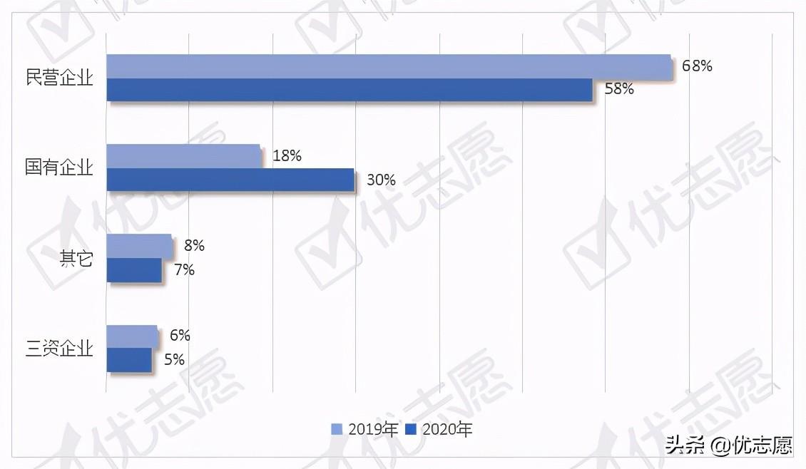 2020年前往国有企业就业的人数占比上升12个百分点,受疫情影响,工作较为稳定的国企更受应届毕业生追捧。