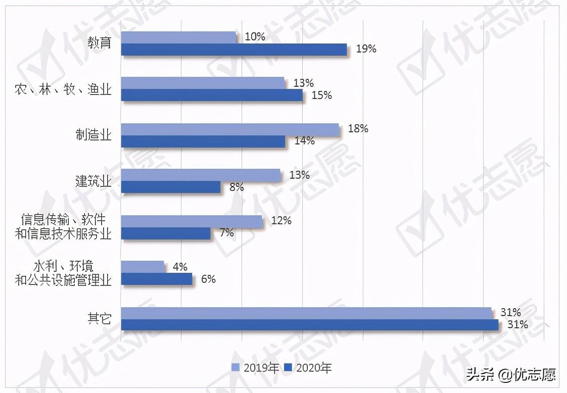 2020年选择教育行业就业的人数占比上升9个百分点,随着线上教育的迅猛发展,教育行业对于双一流院校毕业生的需求量进一步扩大。