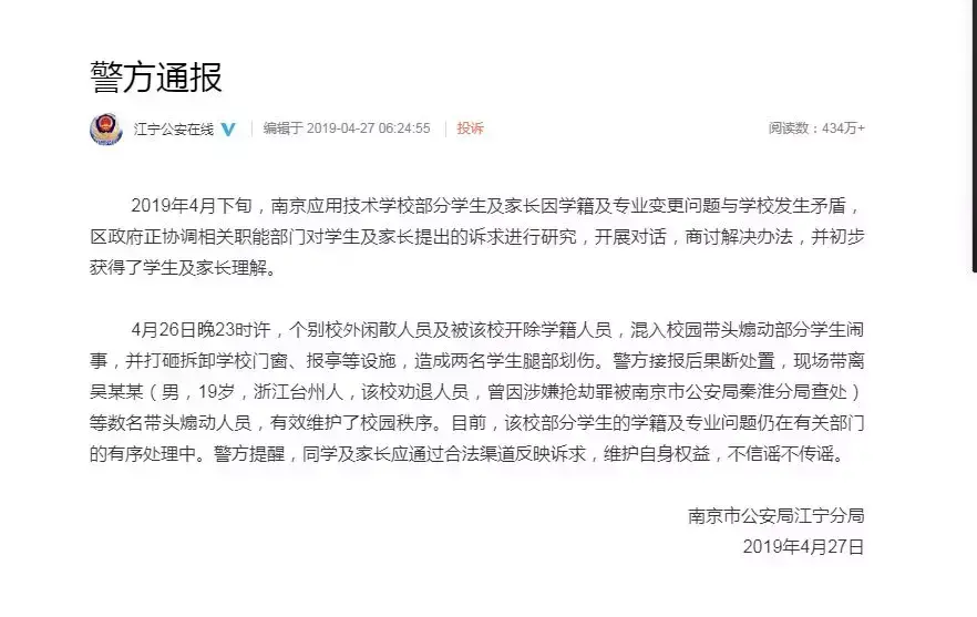 此事引起学生和家长家长不满,南京警方通报,部分学生及家长因学籍及专业变更问题与学校发生矛盾,个别校外闲散人员及被该校开除学籍人员,混入校园带头煽动部分学生闹事,并打砸拆卸学校门窗、报亭等设施,造成两名学生腿部划伤。