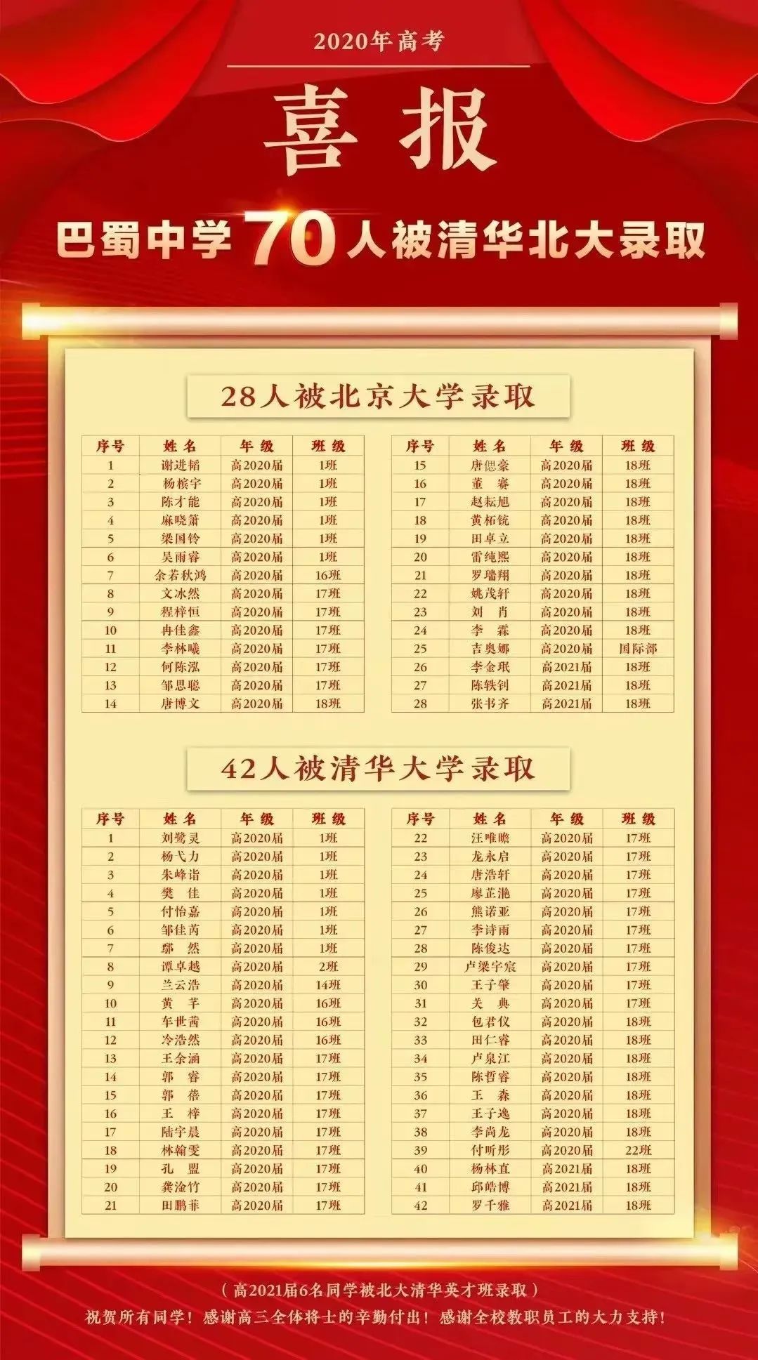 2021年在去年的高考出口里,巴蜀中学的成绩也是惯例的亮眼: