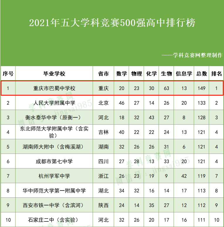 除了单人成就外,巴蜀的综合竞赛成绩更亮眼:根据国家教育部、中国科协官方公示的名单,学科竞赛网制作了《2021全国500强中学之五大学科竞赛“省一”排行榜》,其中,巴蜀中学排名全国第一!