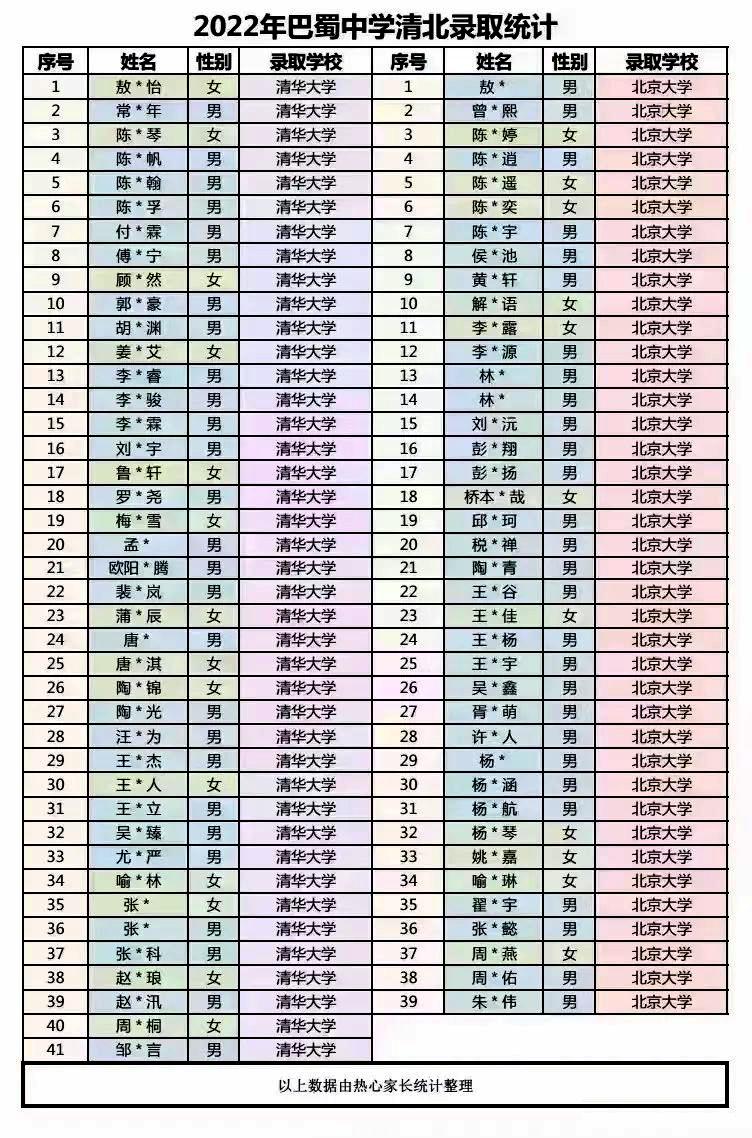 近期,重庆家长圈中盛传一份巴蜀中学清北录取名单,名单中,巴蜀今年清北录取人数再创新高!高达80人!其中清华41人,北大39人。