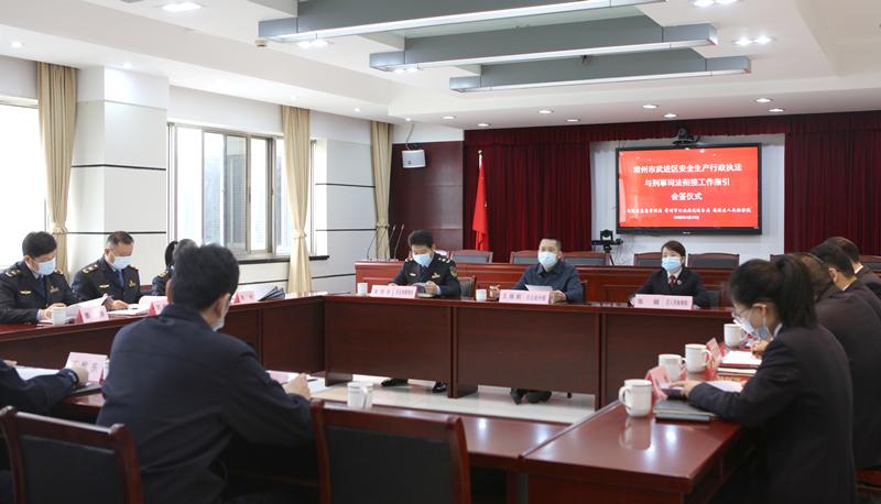 会上,王晓航副区长、张娟检察长和金旭兵局长会签了《常州市武进区安全生产行政执法与刑事司法衔接工作指引》。王晓航副区长指出, 今年是武进区安全生产专项整治三年行动收官之年,区公安分局、检察院、应急管理局应加强执法共识,形成工作合力,共同推动安全生产管理法制化、规范化。张娟检察长表示,区检察院将以会签《工作指引》为契机,凝聚思想共识,明晰重点任务,深化机制落实,加强安全生产领域检察职能与行政执法职能的协作配合。金旭兵局长表示,区应急管理局将把深入推进安全生产领域行刑衔接作为贯彻“两个至上”的自觉行动,密切部门合作,健全联动机制,推动行刑衔接落实落地。