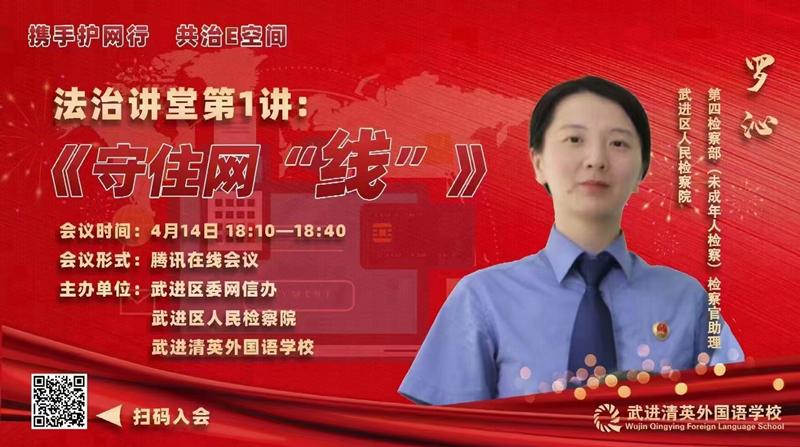 4月14日下午,武进区检察院法治宣讲团成员罗沁受邀为武进清英外国语学校全体学生及学生家长开展“守住网‘线’”主题讲座,该讲座采取网络视频直播形式。