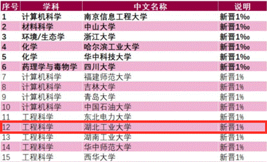 5月14日,科睿唯安(原汤森路透)公布的数据显示,湖北工业大学工程科学首次进入ESI全球前百分之一;9月10日科睿唯安公布数据显示,湖北工业大学新增农业科学进入ESI全球学科排名前百分之一,是继首个工程科学上榜后的又一个学科领域突破,排名上升了35个位次,刷新了学校学科水平的新高度。