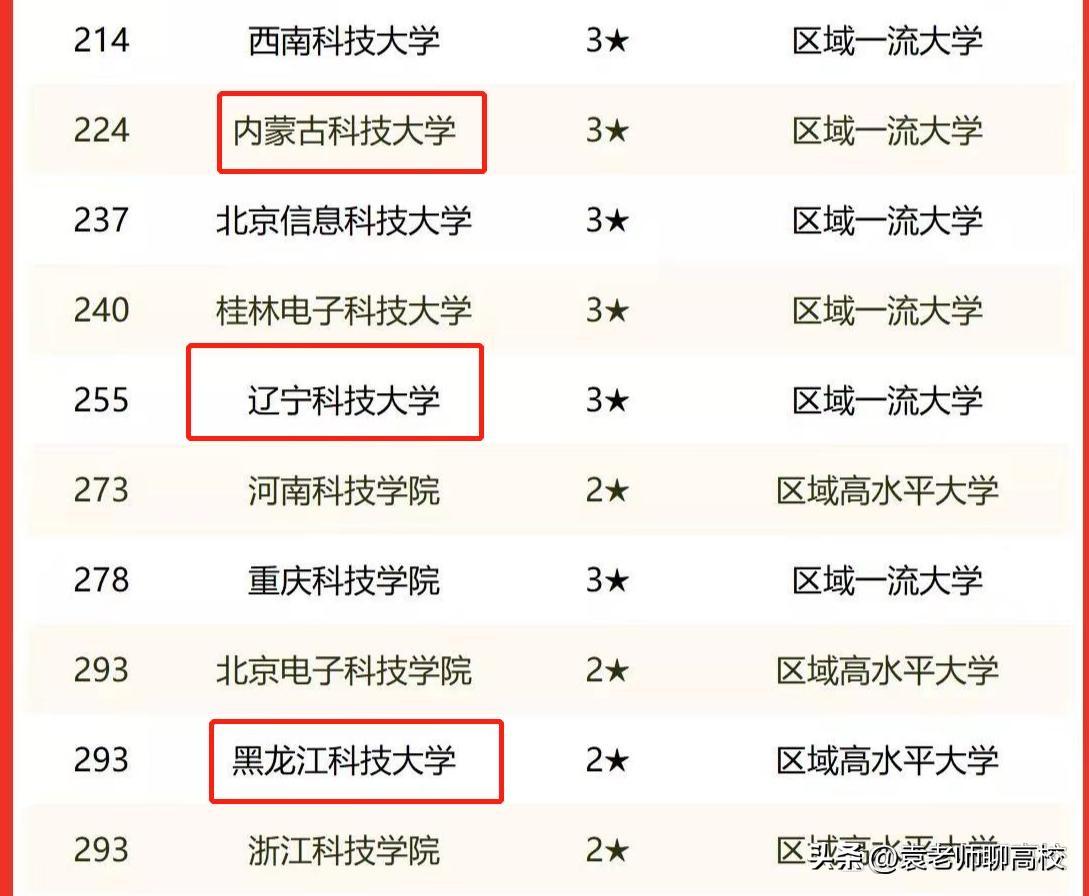 这三所高校都是以科技命名的本科院校,其中黑龙江科技大学位于省会城市哈尔滨,其他两校位于包头和鞍山这样的地级市。