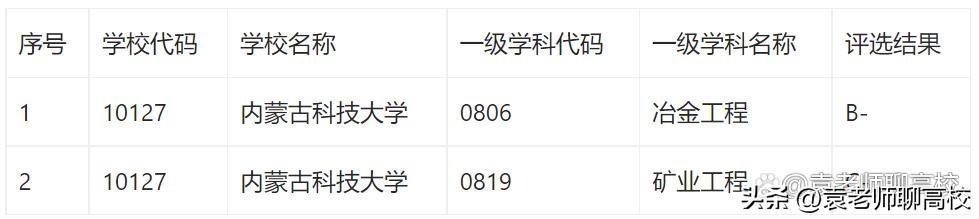 在第四轮学科评估中,内蒙古科技大学有两个学科上榜,其中冶金工程被评为B-,矿业工程被评为C-。