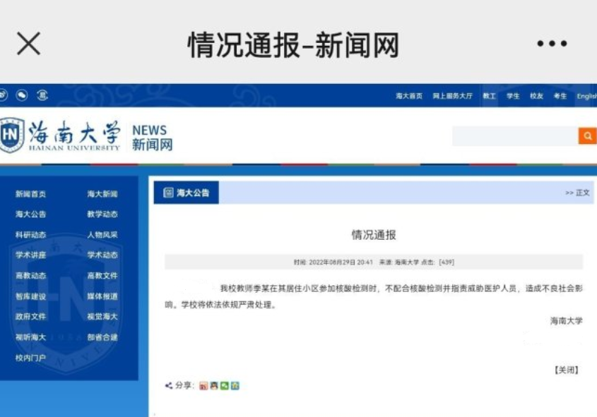 海南大学的通知详情为:我校教师季某在参加“核检”时不配合并且指责威胁医护人员,造成不良影响,学校将以法规严肃处理。