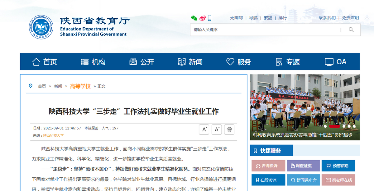 2021届高校毕业生规模达909万人,高校毕业生就业关系民生福祉、社会稳定和高质量发展。一直以来,陕西科技大学高度重视大学生就业工作,面向不同就业需求的学生群体实施“三步走”工作方法,力求就业工作精准化、科学化、精细化,进一步推进学校毕业生高质量就业。9月1日,陕西省教育厅官方网站对此进行了关注与报道。