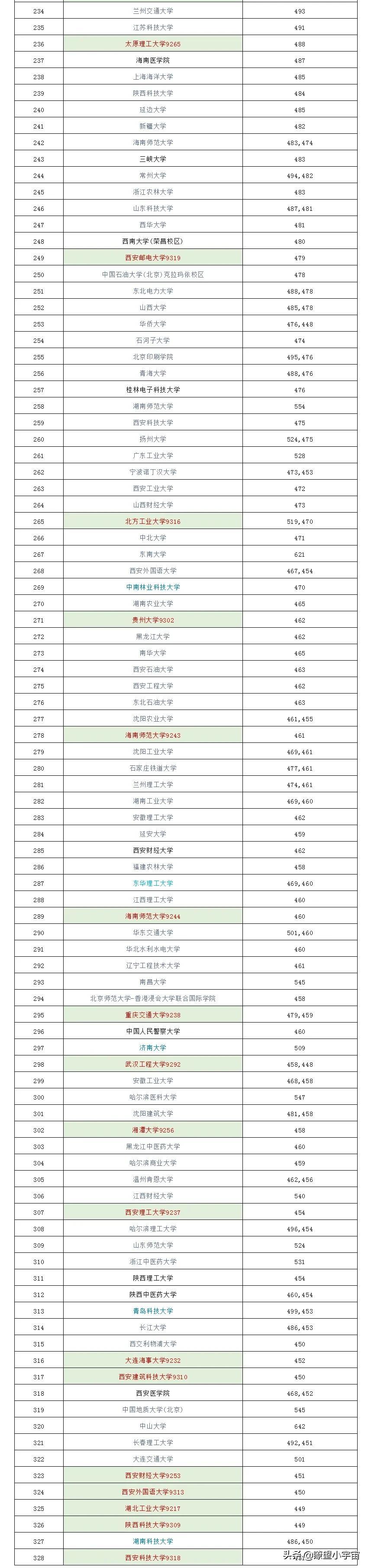 对于预估录取分数线中有2个分数的高校,以高分的为准,因为两个分数中存在高考录取分大小年的影响,图中底色有淡绿色的高校是特殊专业录取分数线,比如中外合作的专业,这种专业录取分数线普遍比普通的录取分数线低很多,由于学费贵,但是他毕业后可以获得双学位这个优势,有的高校是2+2模式,前两年国内高校学校,后两年是在国外学习的模式!这种专业比较适合高考分数刚过一本线或者过一本线1~10分以内的考生,毕竟高考分数这个分数段的很难选到心仪的学校或者专业。而且面对滑档的可能性是非常大的。所以这个分数段的考生,家境殷实的,建议考虑这种高校的专业。