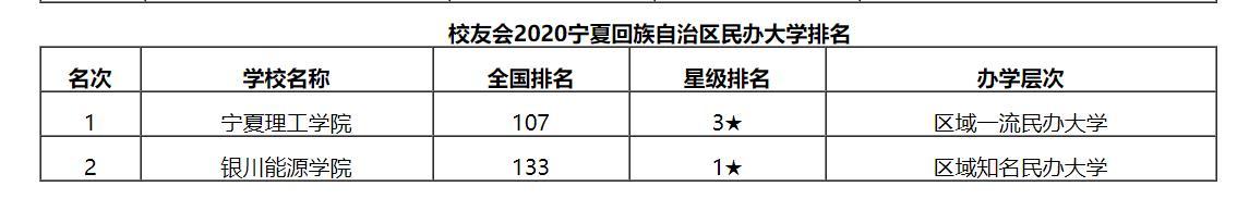 据中国校友会网(艾瑞深中国校友会网 )发布的2020中国大学排行榜中,民办大学排行榜中,宁夏自治区共有2所民办大学进入排名!