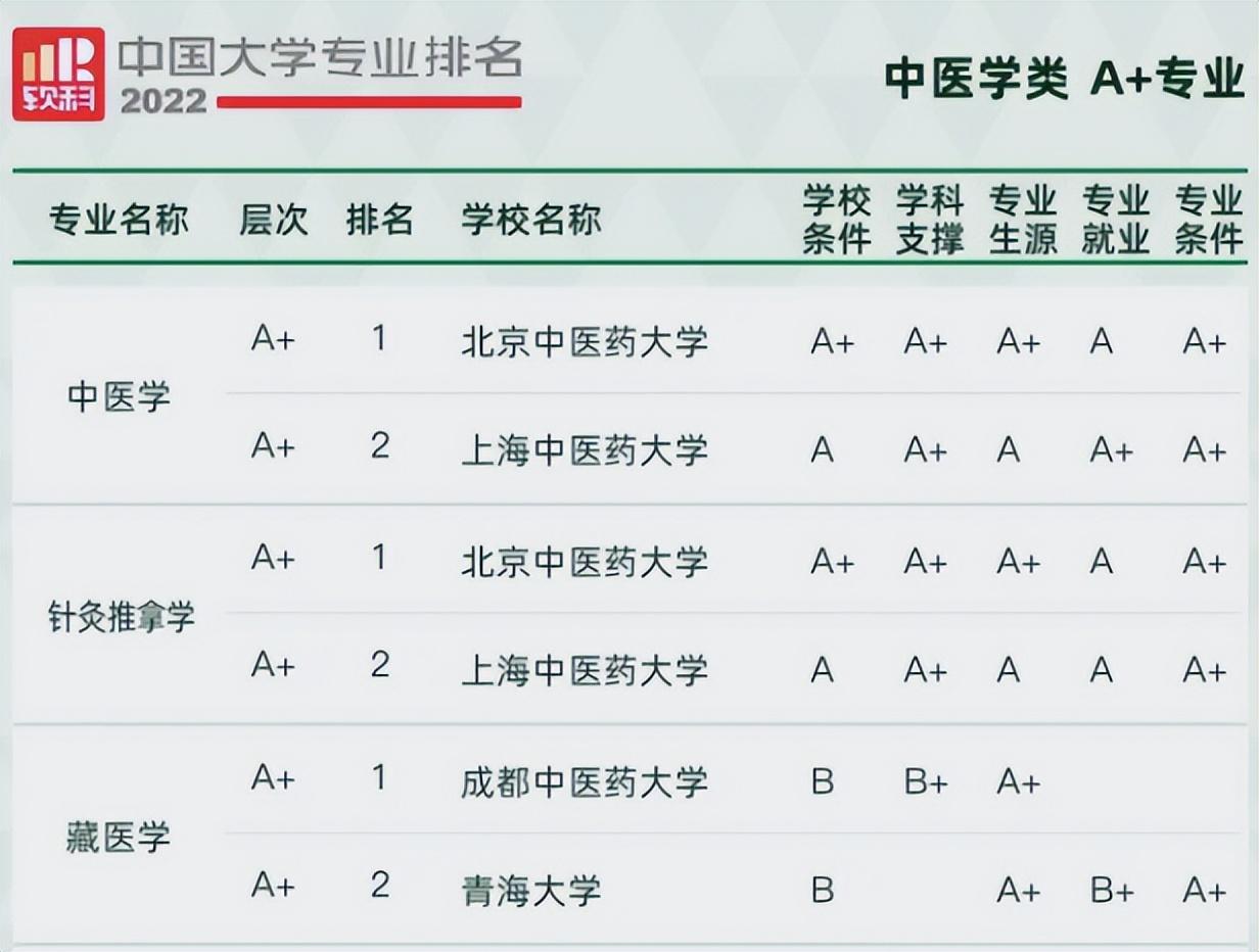 这些A也就是专业真正的含金量,比如中医学上,北京中医药和上海中医药就是天花板。而在藏医学上,成都中医药和青海大学就是天花板。