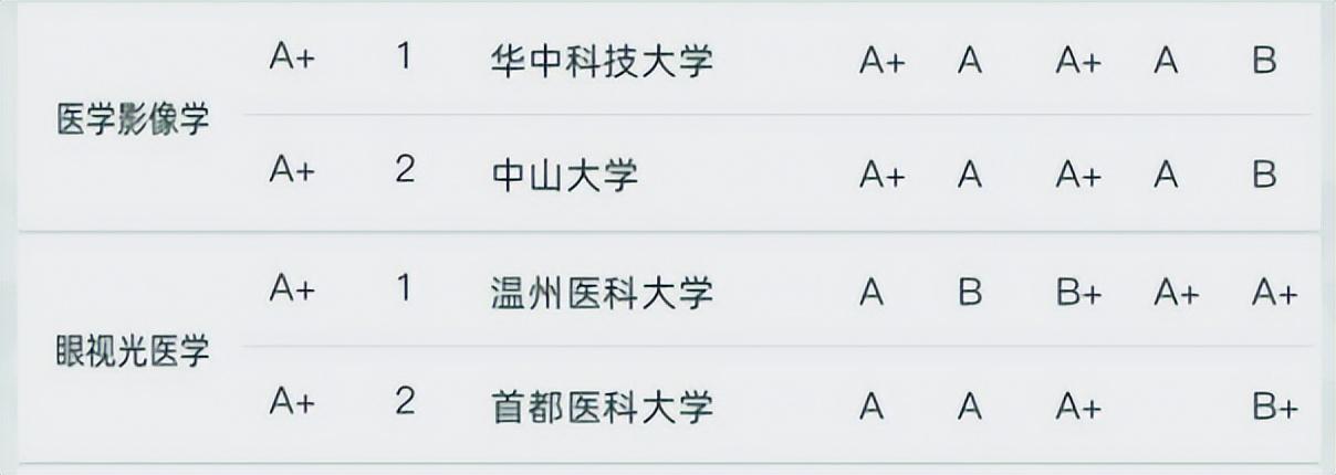 医学影像学的强势院校也有中山一个,另一个也是四大天王之一的华中科技大学同济医学院。眼视光医学强势的两所大学分别是温州医科大和首都医科大,两个都是近年的热门专业。