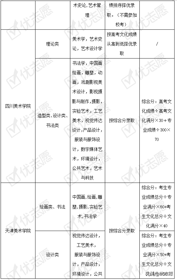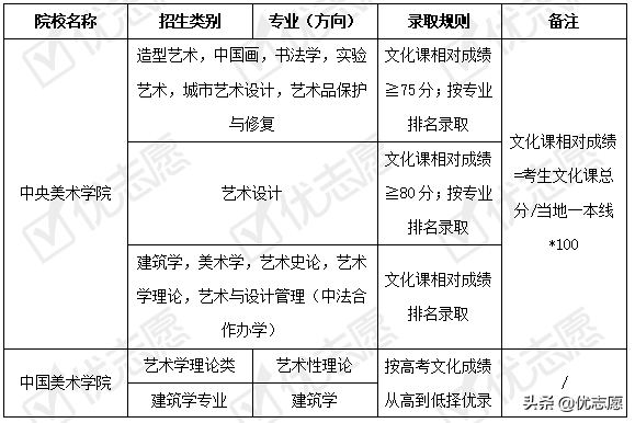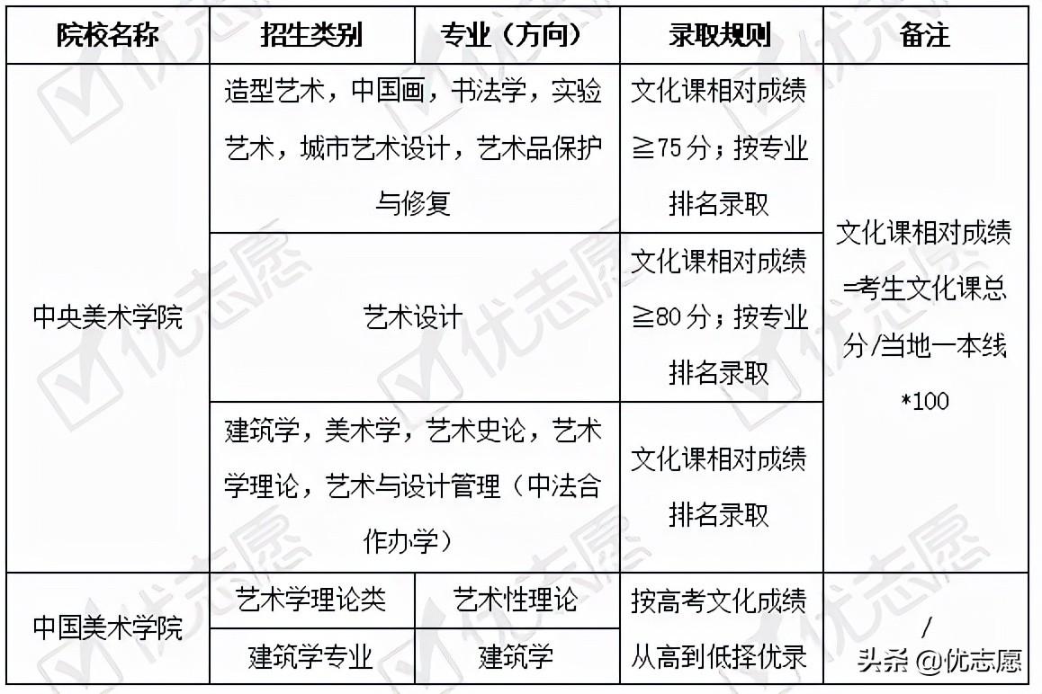 八大美院的艺术类专业均需要参加省统考,省统考合格后,部分专业需要参加校考,八所院校的理论类专业均不需要参加校考,按高考文化分从高到低择优录取。