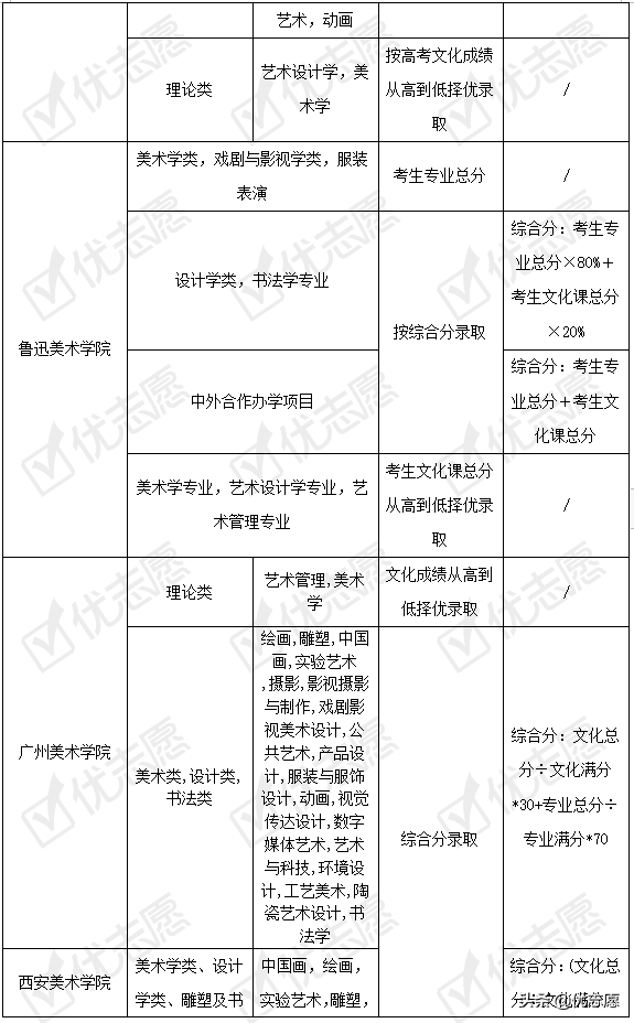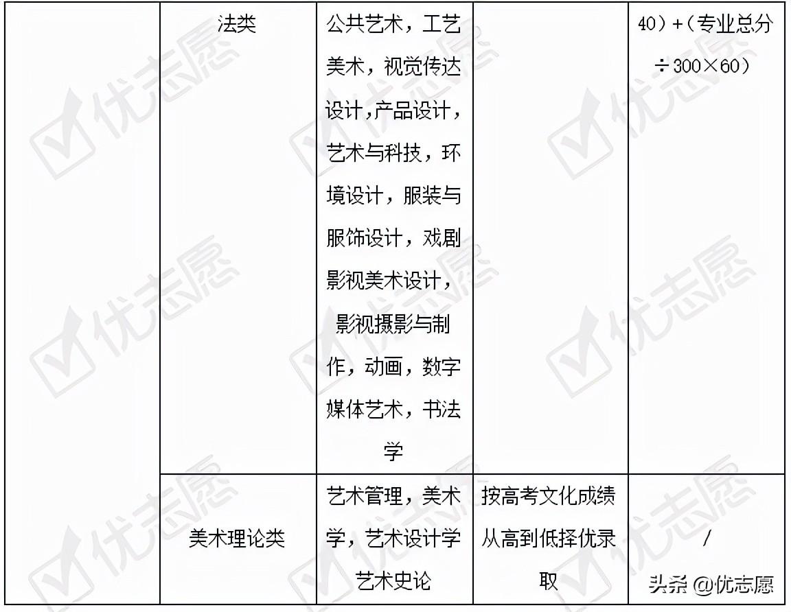 大部分专业按综合分进行录取,中国美术学院、湖北美术学院、西安美术学院三所院校综合分计算规则中,文化分占比40%,专业分占比60%。湖北美术学院书法学专业综合分文化分占比达60%,书法专业需要较高的高考文化成绩。