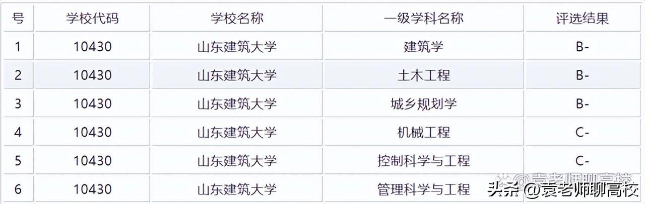 在第四轮学科评估中,山东建筑大学有6个学科上榜,其中最强的学科是建筑学、土木工程和城乡规划学等三个学科,被评为B-,具体可见下图。