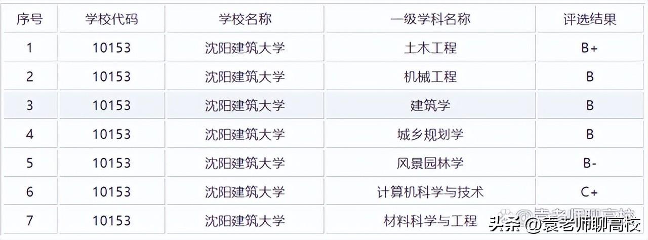 在第四轮学科评估中,沈阳建筑大学有7个学科上榜,其中最强的学科是土木工程,被评为B+,机械工程、建筑学和城乡规划学等三个学科被评为B,具体可见下图。