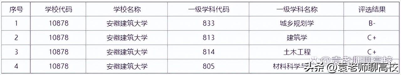 在第四轮学科评估中,安徽建筑大学有4个学科上榜,其中最强的学科是城乡规划学,被评为B-,建筑学和土木工程等两个学科被评为C+,具体可见下图。
